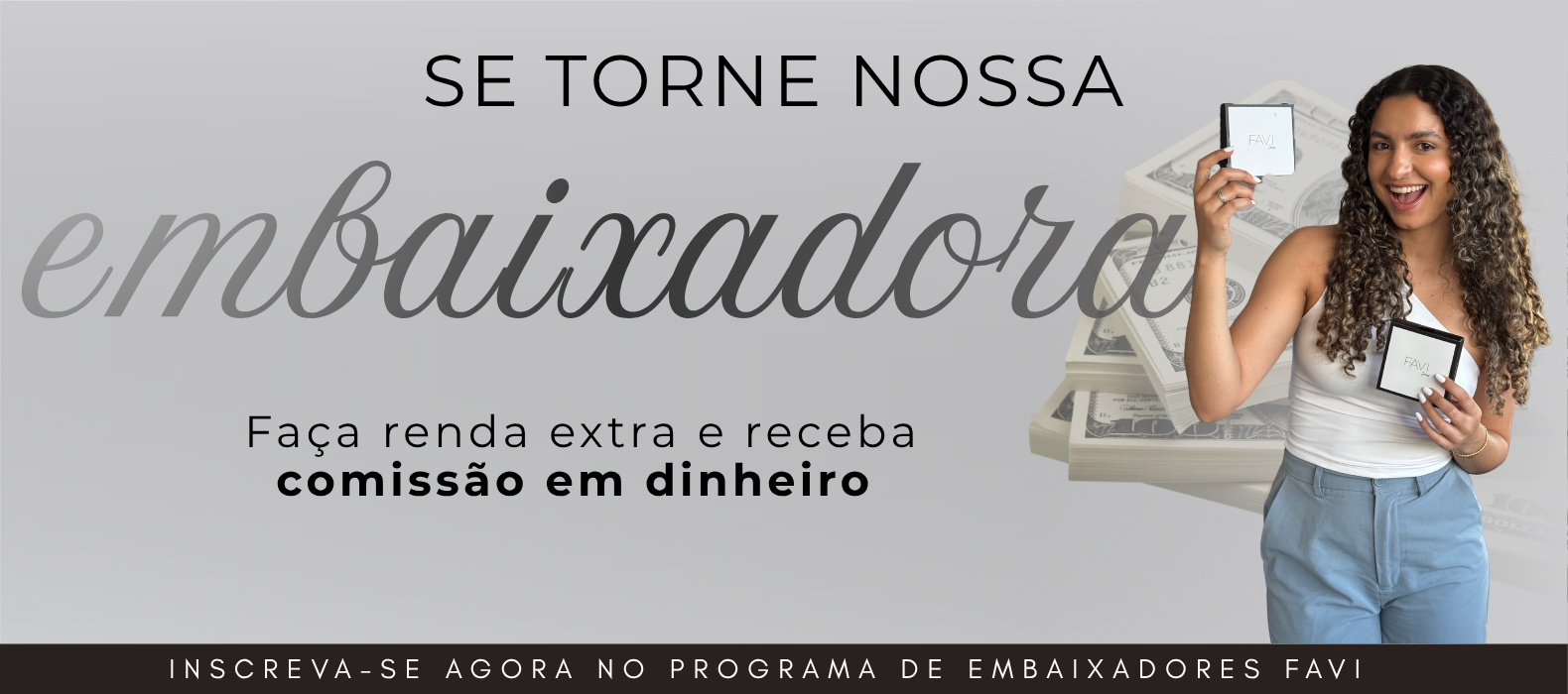 Nosso programa de Embaixadores Favi foi criado a pedido des clientes e admiradores que ficarão tão apaixonados pela marca que se tornaram divulgadores oficiais enquanto ganham uma renda extra. Este é o espaço onde você pode ganhar comissões e prêmios exclusivos ao divulgar a Favi para amigos e conhecidos.